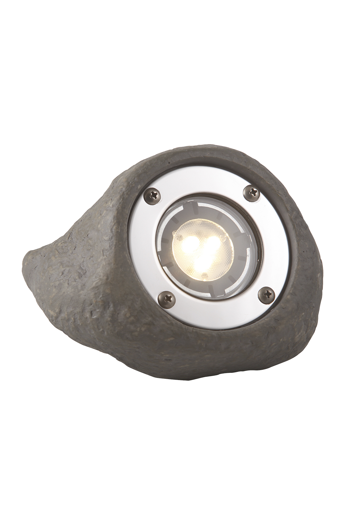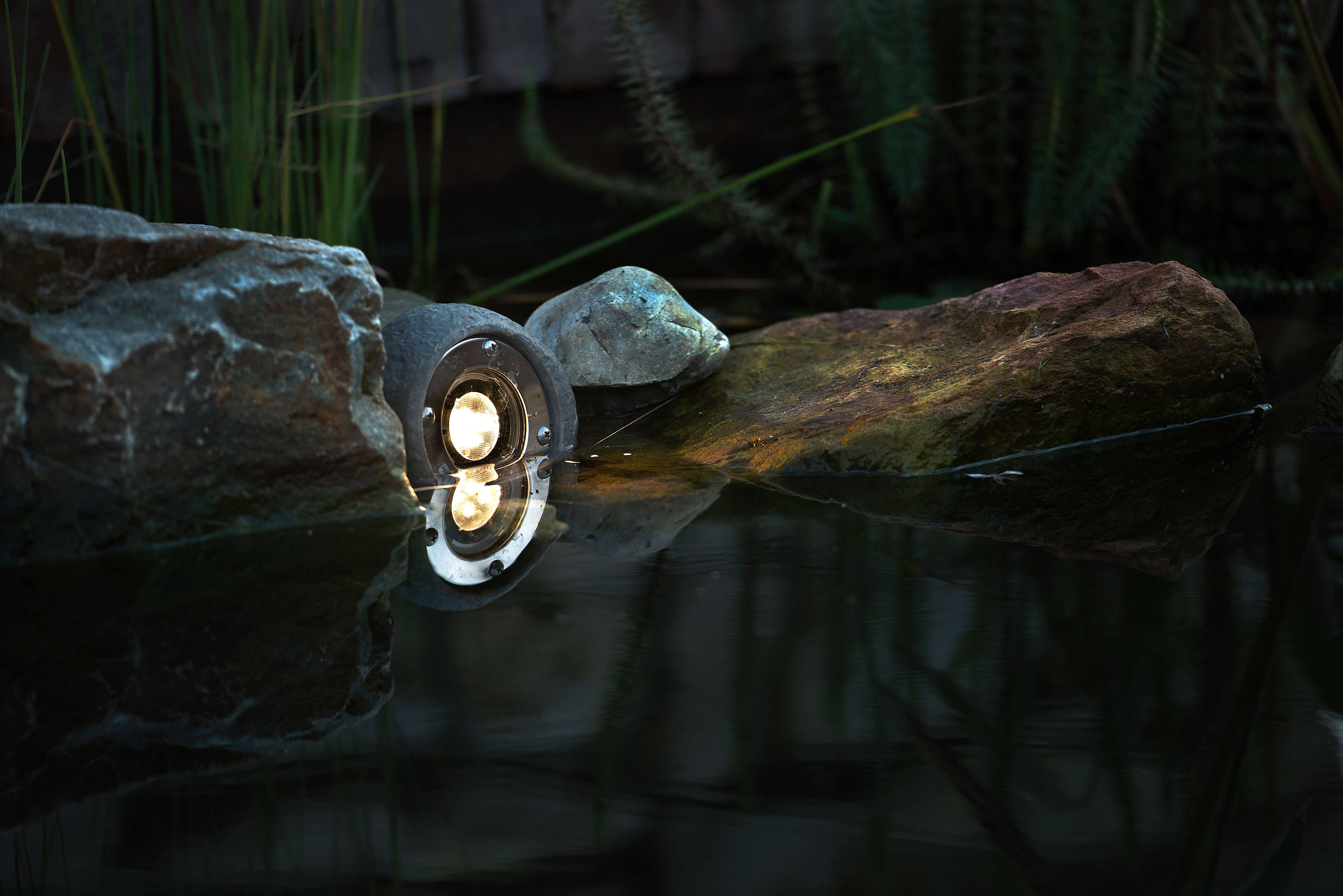 Aivan luonnollisen kiven näköinen ja painoinen kohdevalaisin jonka voi asentaa vaikkapa vesilähteeseen tai rantaveteen.