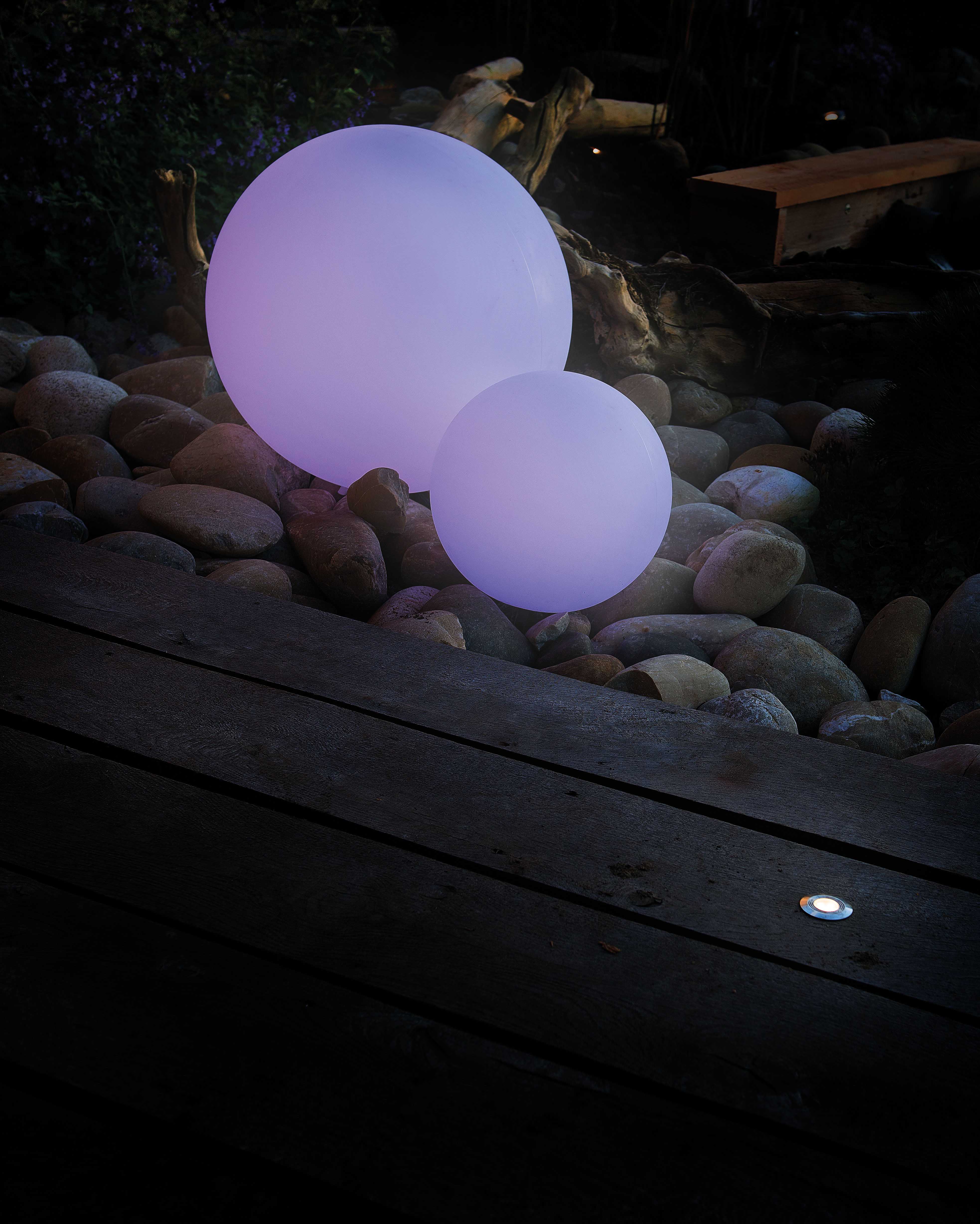 Pyöreä, halkaisijaltaan 30 cm väriä vaihtava tunnelmavalaisin. Kaukosäätimellä voit valita valaisimen värin tai automaattisesti vaihtuvan värin. Sen voi säätää myös loistamaan valkoisena tai loimuamaan kuin kynttilän liekki.